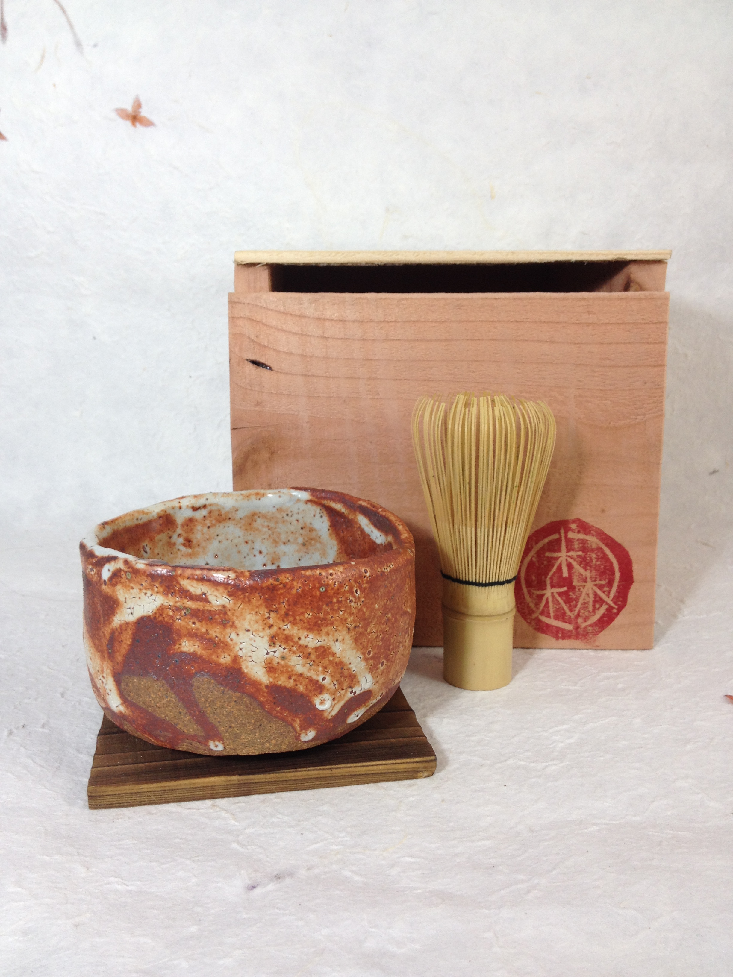 Each bowl is unique and carries the maker’s stamp. Bowls may be ordered with a custom-made wooden storage box, as pictured. Paired with a bamboo whisk, they make a perfect gift or set.